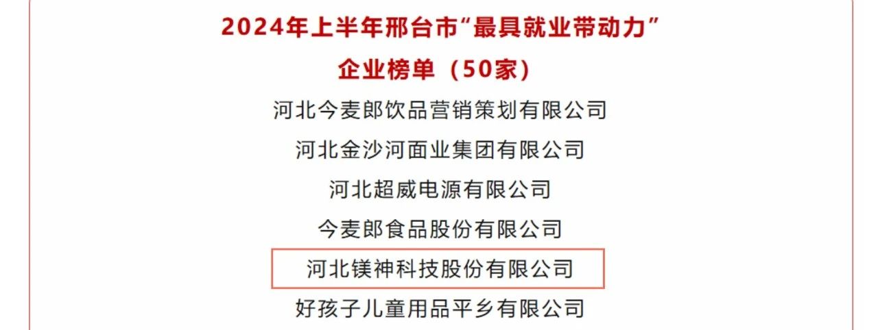 2024年7月15日 邢臺市人社局發布 邢臺市“最具就業帶動力”企業榜單 河北鎂神科技股份有限公司榮譽上榜 ..