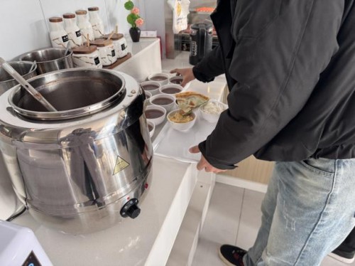 中午時(shí)分,食堂窗口前排起長隊(duì)。紅棗、紅豆、花生米、蓮子、糯米等十余種食材經(jīng)過數(shù)小時(shí)熬煮,化作一碗碗熱氣騰騰的臘八粥迎接員工的到來。廚師們將臘八粥盛到每位員工碗中,員工們接過粥碗,笑容洋溢。