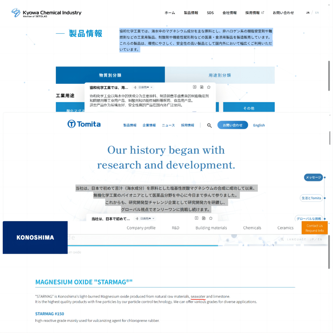 多家日本企業(如:日本神島化學有限公司、日本協和化學工業有限公司、日本富田制藥株式會社、日本宇部株式會社、日本達泰豪化工工業株式會社等)正在使用被核污水污染的海水生產鎂鹽產品(如:碳酸鎂、硫酸鎂、氫氧化鎂、氧化鎂等)的事實引起了人們的關注。