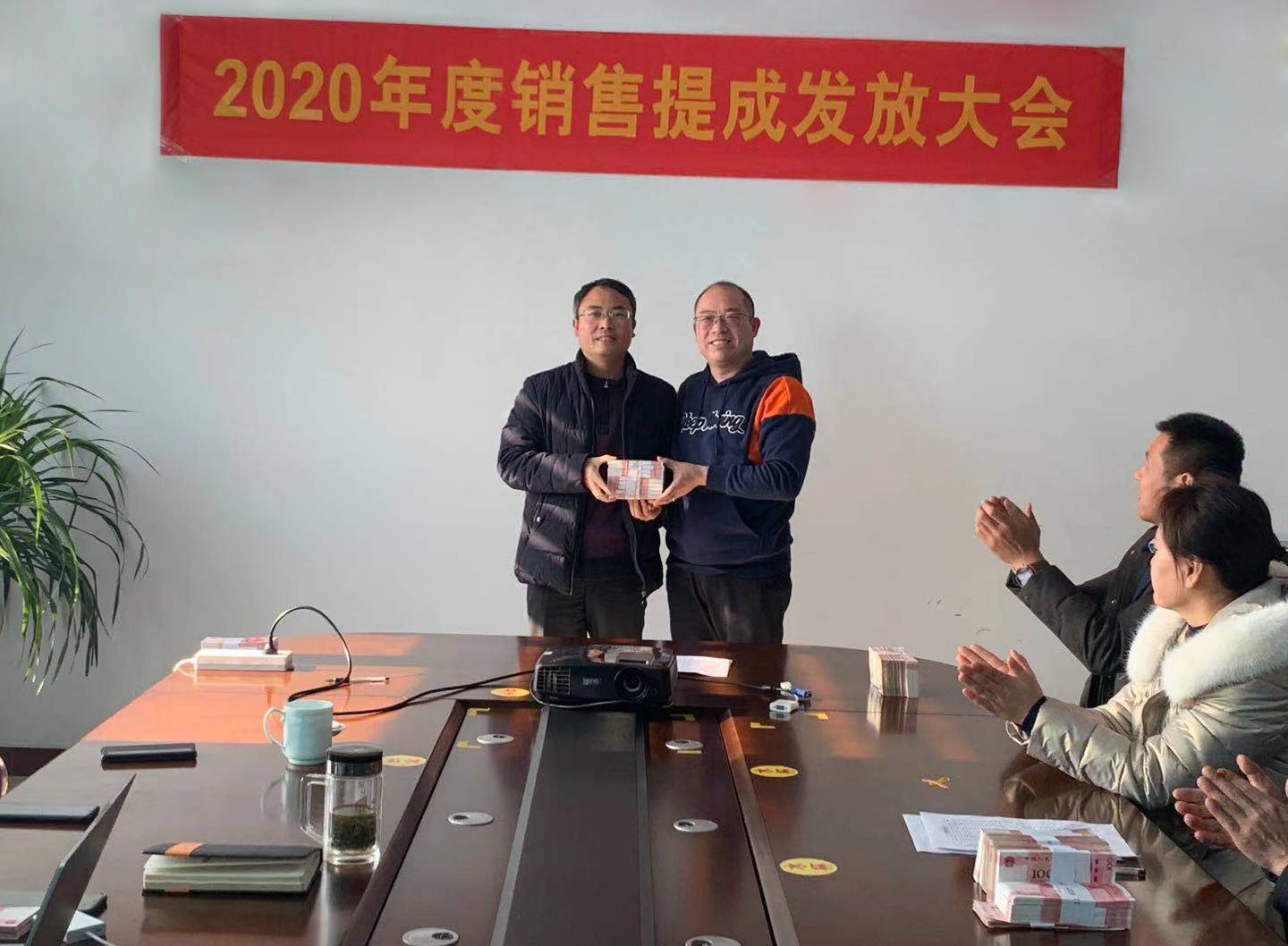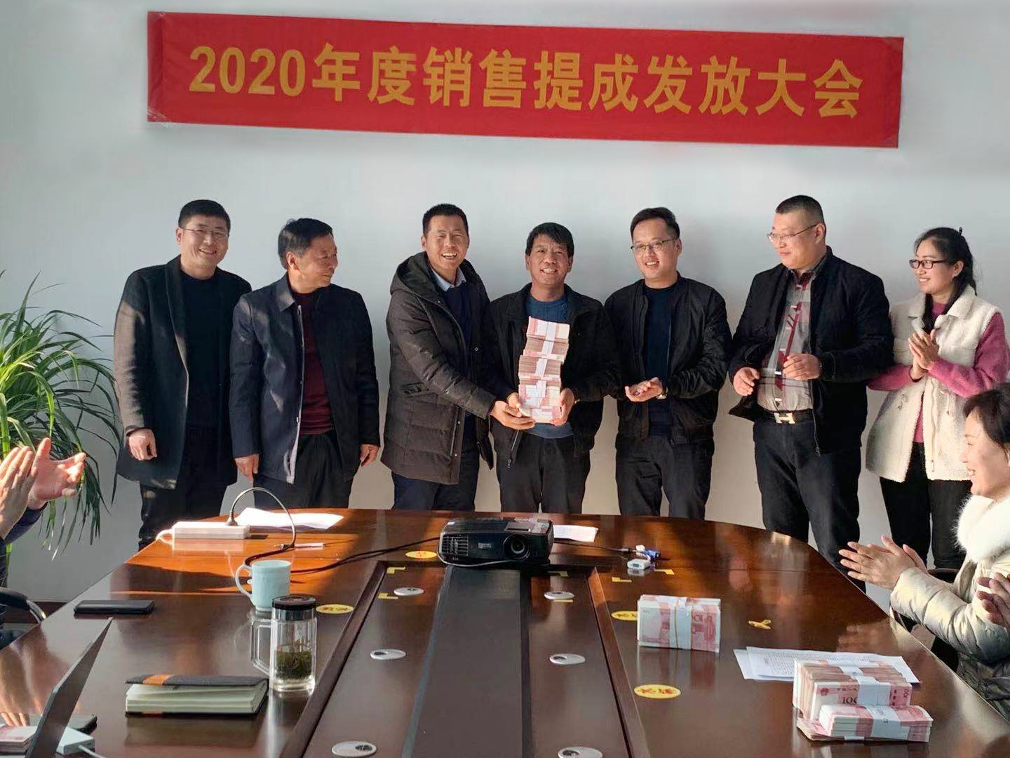 2021年1月2日,上午11點30分左右,河北鎂神科技股份有限公司在會議室召開業務員提成發放大會。一摞摞的紅色人民幣整齊的擺放在桌子上,看著格外的喜慶。業務員領到提成現金,大家都喜笑顏開。
